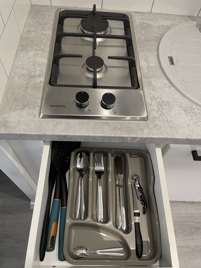 - кухня полноценно укомплектована посудой для приготовления и приема пищи